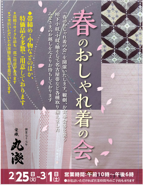 HOME 2025.02.242023.04.01 染織 丸浅からのごあいさつ 昭和22年世田谷区豪徳寺で創業。昭和28年世田谷区代沢に移転いたしましてから、お陰様で創業76年を迎えております。当店は京友禅、各産地袖、西陣織等、各種取り扱いの呉服専門店でございます。また別注での御誂えからお手入れまで、お着物に関するすべてのことを承っております。 2022年2月より店舗を移転いたしました。 店舗情報はこちら